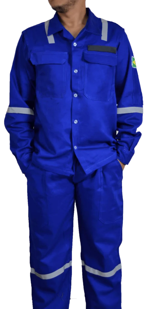 Fita refletiva 25mm (ombros, braços, pernas), gola polo/esporte (tipo camisa), fechamento com botões e espelho, mangas longas punho com velcro,, 6 bolsos (peito: 2 com tampa; calça: 2 na frente e 2 traseiros), calça com elástico 50 mm total, velcro para identificação de nome, logomarca da empresa bordado em pet (peito: no bolso; costas: grande), bandeira do Brasil e caneteiro